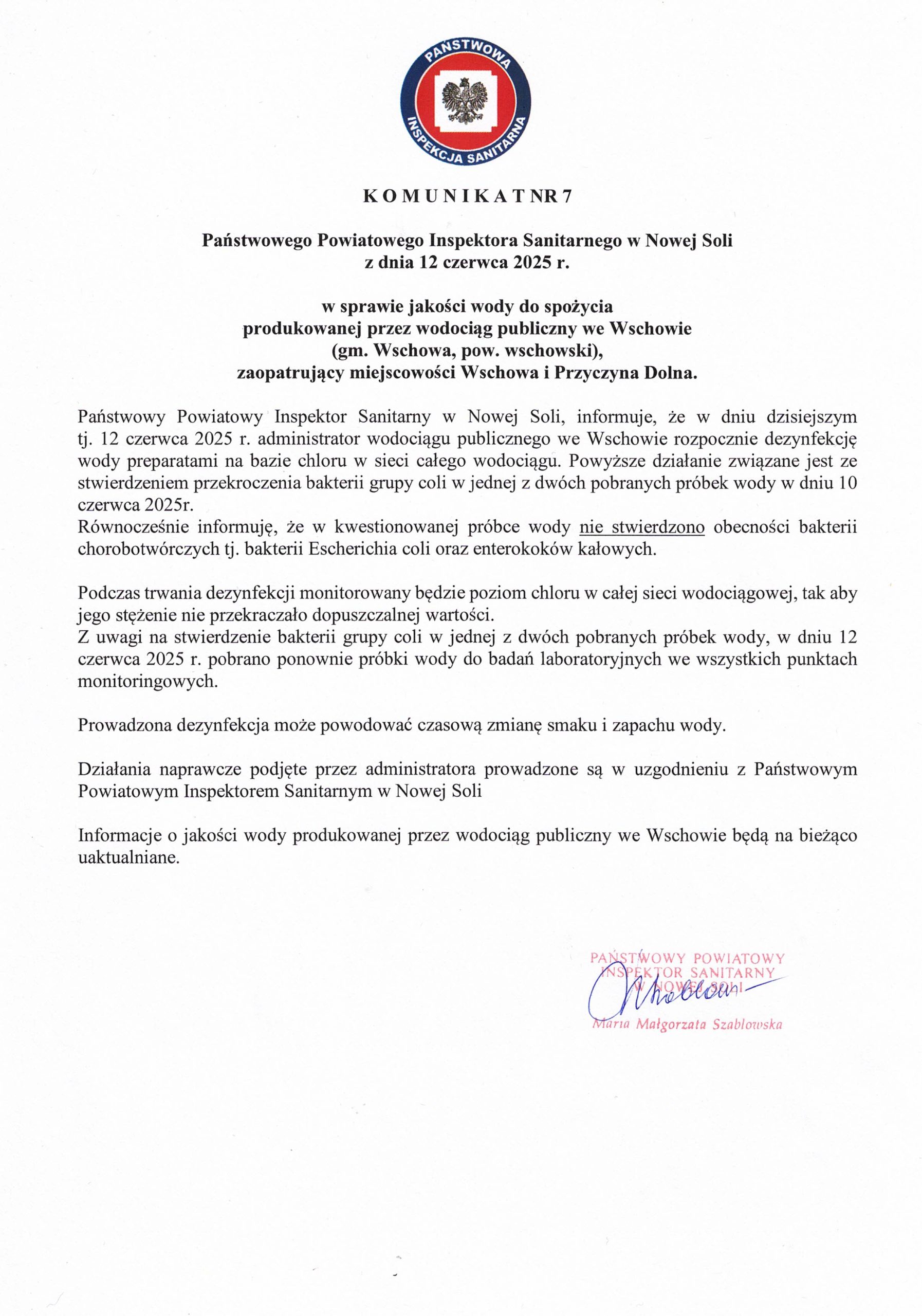 Państwowy Powiatowy Inspektor Sanitarny w Nowej Soli informuje, że w dniu 12 czerwca 2025 r. administrator wodociągu publicznego we Wschowie rozpocznie dezynfekcję wody preparatami na bazie chloru w całym wodociągu.
