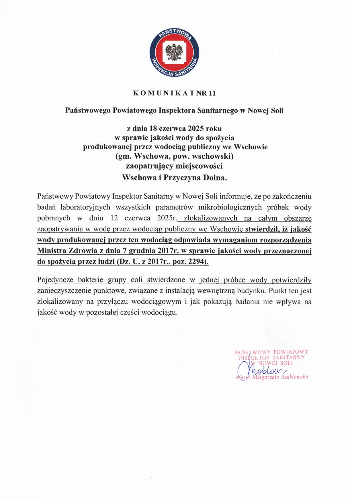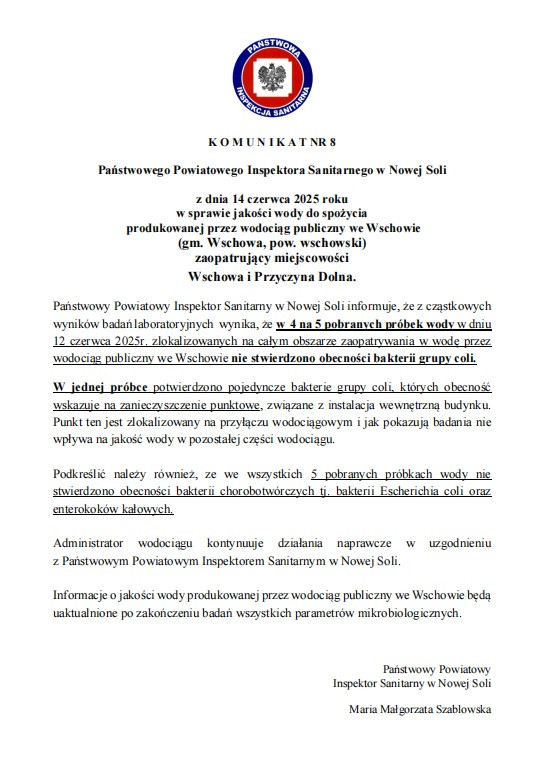 Państwowy Powiatowy Inspektor Sanitarny w Nowej Soli informuje, że z cząstkowych wyników badań laboratoryjnych wynika, że w 4 na 5 pobranych próbek wody w dniu 12 czerwca 2025r. zlokalizowanych na całym obszarze zaopatrywania w wodę przez wodociąg publiczny we Wschowie nie stwierdzono obecności bakterii grupy coli. W jednej próbce potwierdzono pojedyncze bakterie grupy coli, których obecność